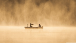 A father and his son, fishing in a lake. Created by Mike Hollingshead.