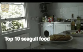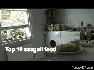 A seagull sneaks into a man's kitchen and eats an entire plate of food before flying into a window.