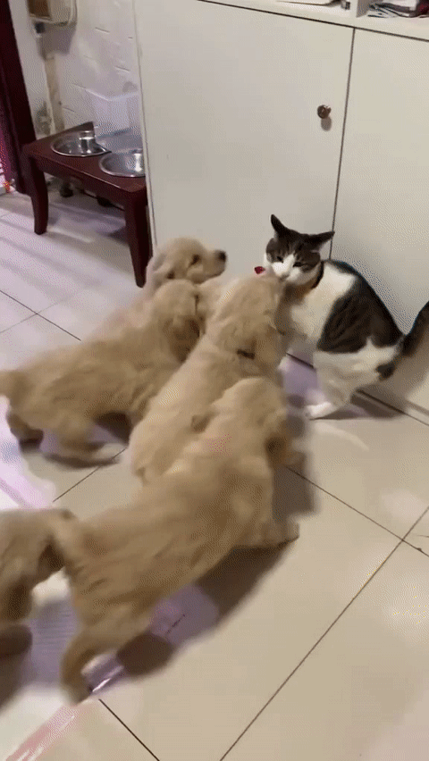Cat escapes from puppies 🤣