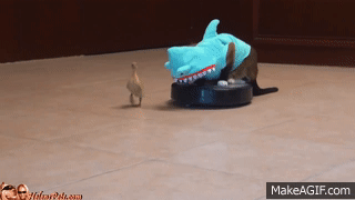 Cat In A Shark Costume Chases A Duck While Riding A Roomba