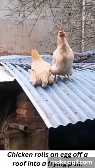 Chicken rolls egg off roof into frying pan.