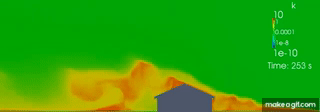 Compressible Navier-Stokes Equations - Building in an atmopheric boundary layer (slow motion))