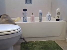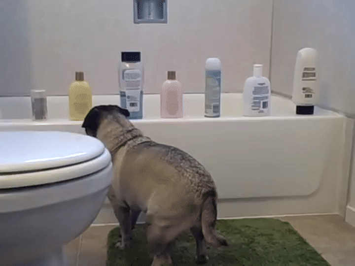 Cute pug attacks shampoo bottles