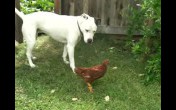 Dog and chook play 'chicken'
