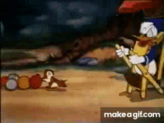 Donald Duck trying to chase a Chipmunk stealing his food