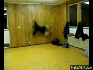 Dummer Junge springt gegen die Wand