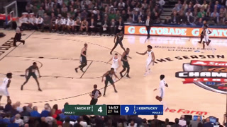Hagans off double screen, probes, probes, long cross over dribble, top of key jumper on Winston