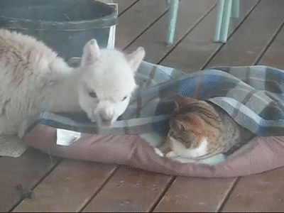 Lacey the alpaca cuddles with the cats! She may even think she is a cat!