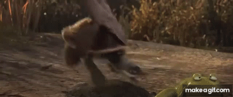 Peng throws Larry the Turtle at the gong
