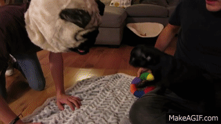 pug being scared by big pug