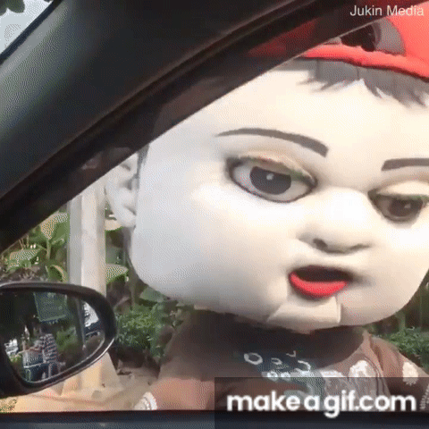 Strange mascot approaches car