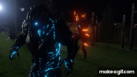 vibes through the suit and makes p fall off of it then looks at him Savitar